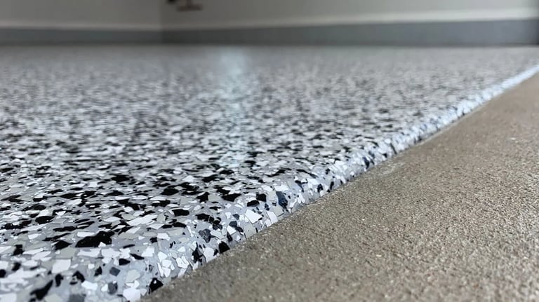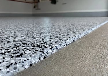 We begin every project with diamond grinding to ensure strong adhesion. After repairing cracks and imperfections, we apply a durable epoxy basecoat followed by a full flake broadcast for added texture and appearance. The system is finished with a polyaspartic topcoat that provides long-term protection and UV resistance.